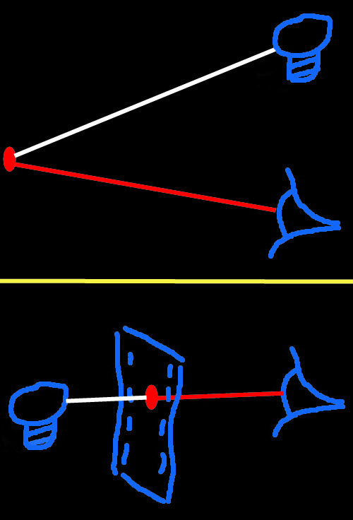 Lorsqu'elle parvient sur la tache rouge, seule la lumière rouge est réfléchie, ou passe à travers, et parvient à l'oeil.