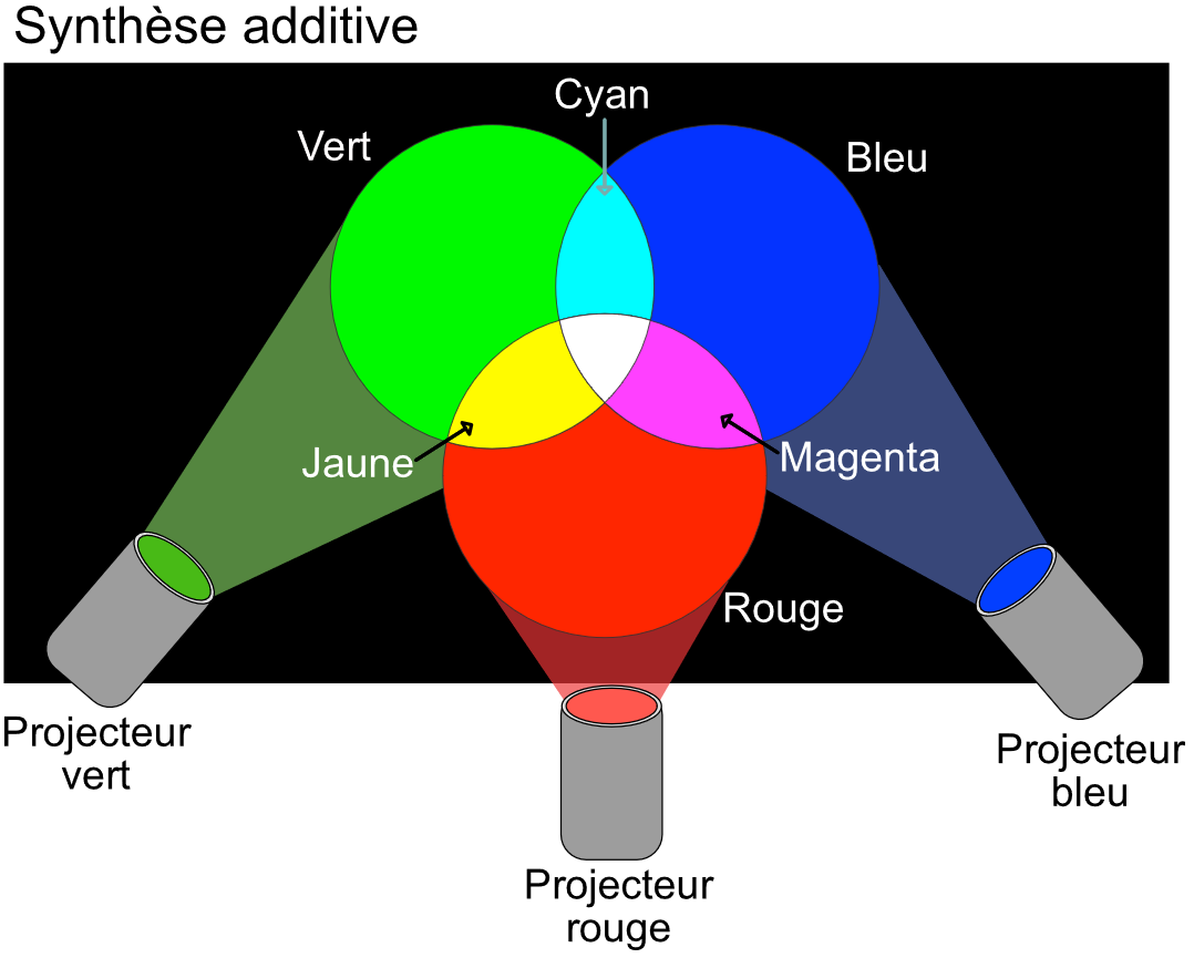 Notez, au passage, que la perception de couleur par projection vers l'oeil de trois lumières primaires, qui s'ajoutent, porte le nom de synthèse additive des couleurs.