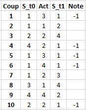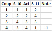 Dans cet exemple simple, une note négative, -1, est attribuée lorsque l'action provoque un dépassement de limite ou un retour à un état déjà rencontré.