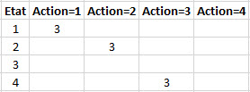 D'après cette matrice, c'est l'action = 1 qui à la meilleure note en état 1, l'action = 2 en état 2, l'action = 3 en état 4, ....