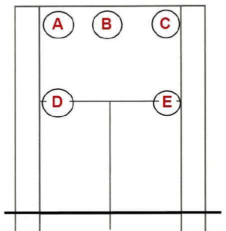 Le joueur droitier peut, en coup droit, toucher les cibles B C D dans le fond du court adverse.