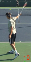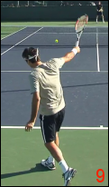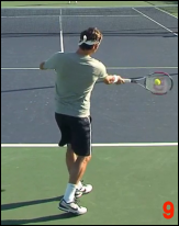 poignet et tête de raquette montante (9). En même temps, le poids du corps se porte vers l'avant et le bras libre libère le passage tout en participant à l'équilibre