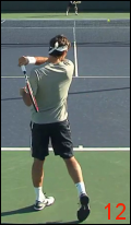 La raquette brosse (sécurité) et accompagne (précision) la balle à partir de la frappe (9-11).