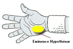 Le gras de la main sous l'auriculaire (éminence hypothénar, H) sert traditionnellement de repaire pour décrire les prises de raquette.