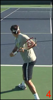 écarté du tronc. La main reste derrière le poignet qui se relâche et laisse descendre la tête de raquette (4-5).