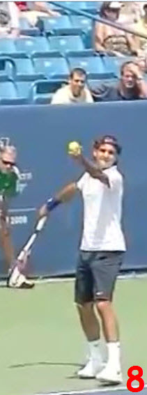 Le lancement commence lentement le mouvement et permet d'envoyer la balle à l'endroit de frappe (8). Le bras libre s'élance pour lancer la balle suffisamment haut.