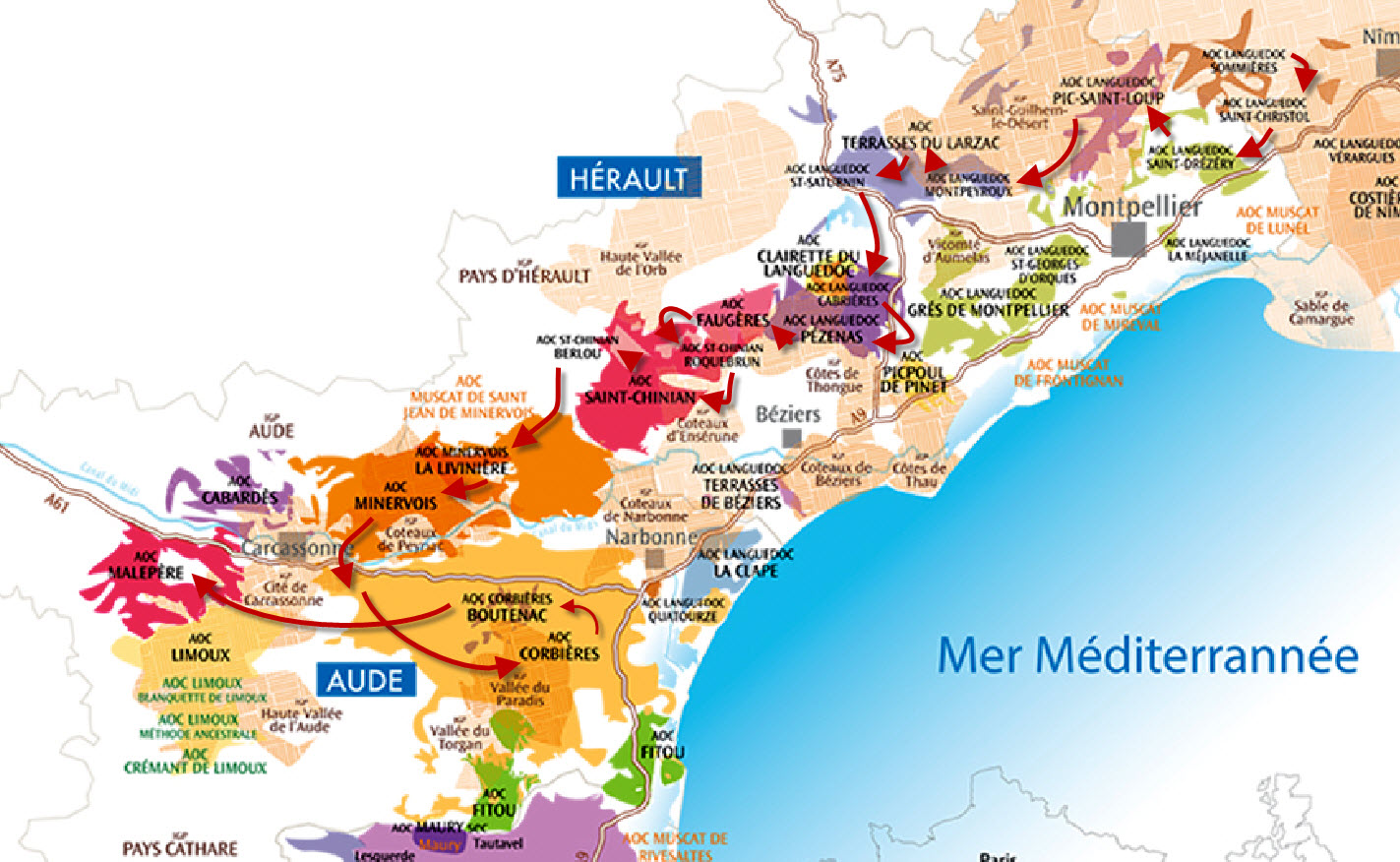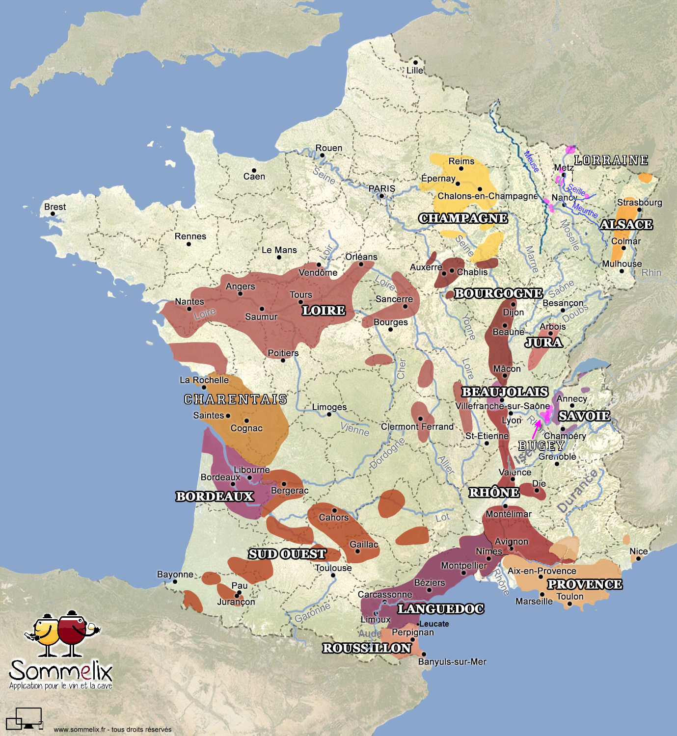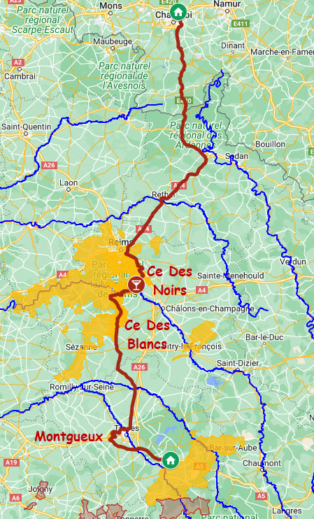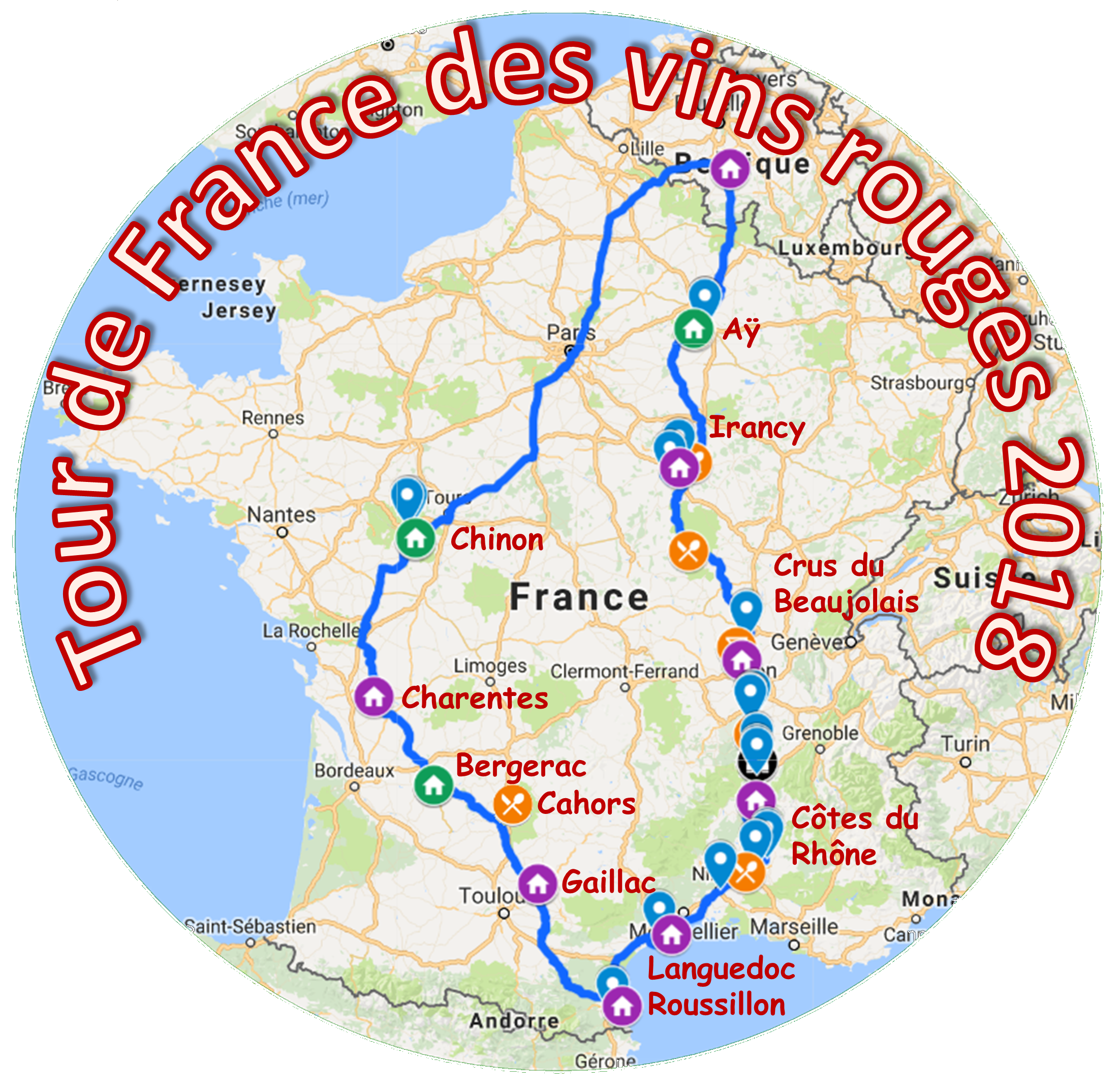 - tour de France, Champagne, Bourgogne, Beaujolais, Rhône, Languedoc, Sud Ouest;