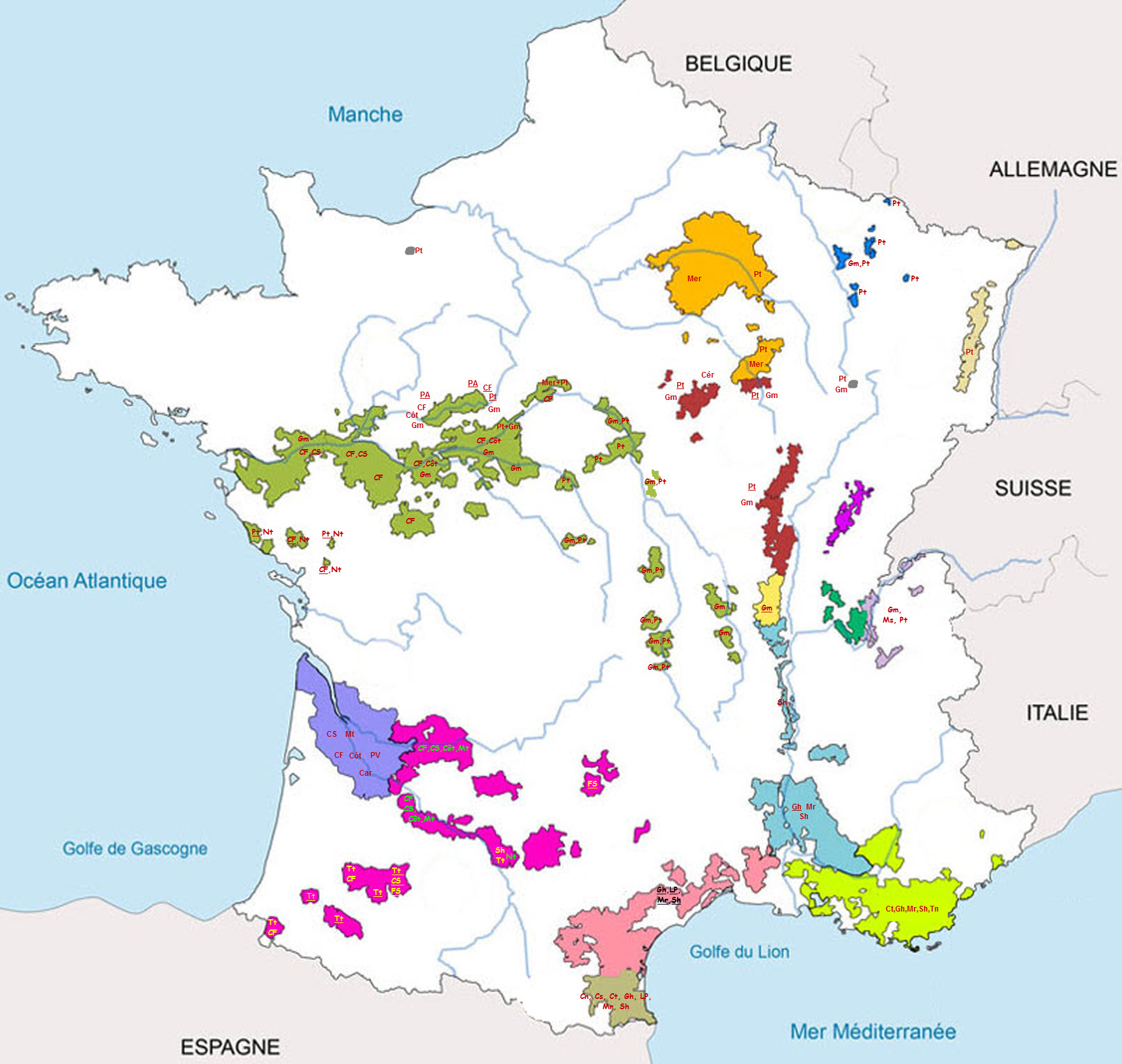 Carte théorique des principales aires d'appellations d'origine de France