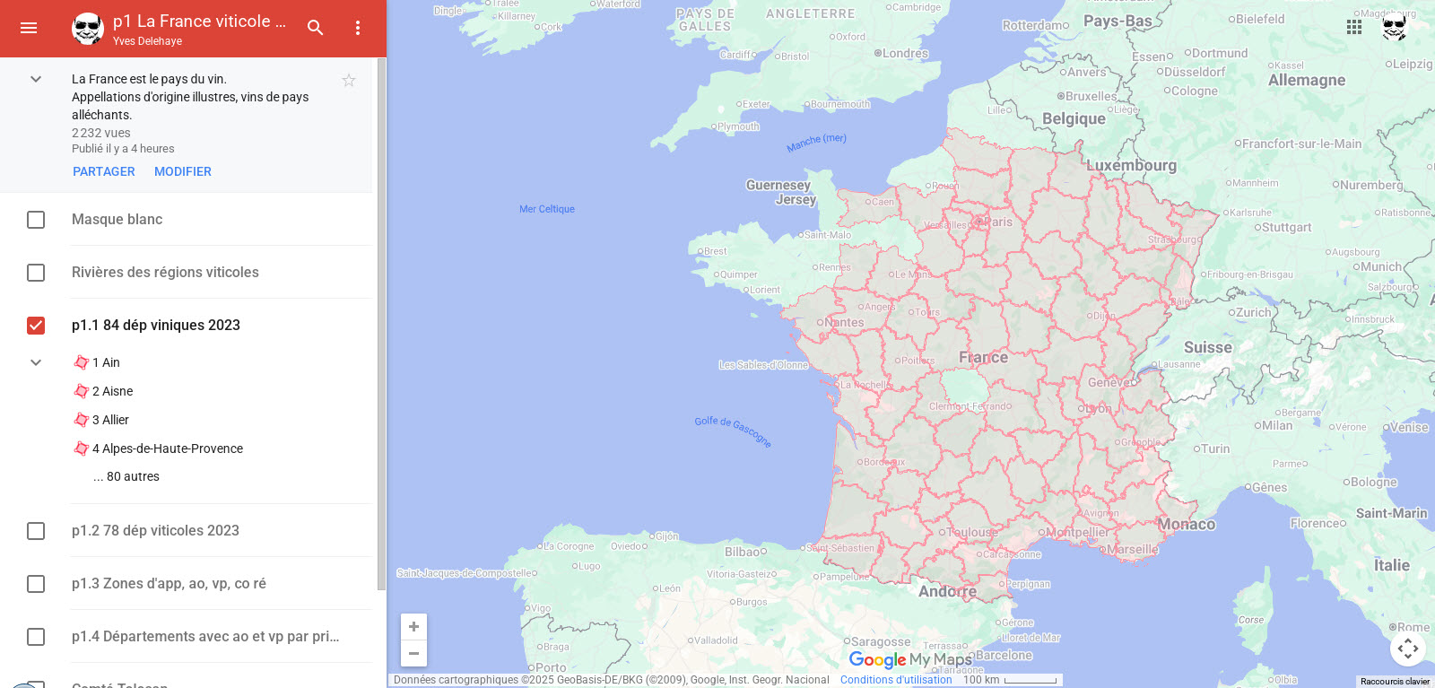 Je trouve Google My Maps, GMM, qui permet de dessiner, sur la carte, les contours des départements.